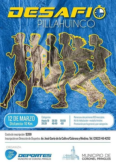 El domingo 12 de marzo se realizará esta carrera de 10 km. denominada "Desafío Pillahuincó", organizada en distintas categorías por edades (hasta 19 años, 20-29, 30-39, 40-49, 50-59, más de 60). El costo de la inscripción es de $200, incluye remeras para los primeros 100 inscriptos, kit de hidratación + medalla finisher, premiación por la general y categorías.